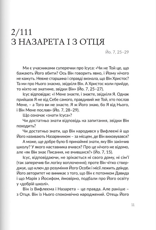 Книжка містить 111 розважань до текстів Святого Письма. Їх автор, кардинал Ґжеґож Рись, пропонує лаконічну і змістовну інтерпретацію біблійних уривків, підкріплюючи прикладами з Нового Завіту свої міркування про природу людського духа, а також – про одвічне протистояння правди і фальші, чесности і лицемірства, жорстокости і милосердя. Глибоко, влучно й водночас просто – ця особливість авторського стилю робить книжку притягальною і заохочує до щоденного спілкування зі Святим Письмом.