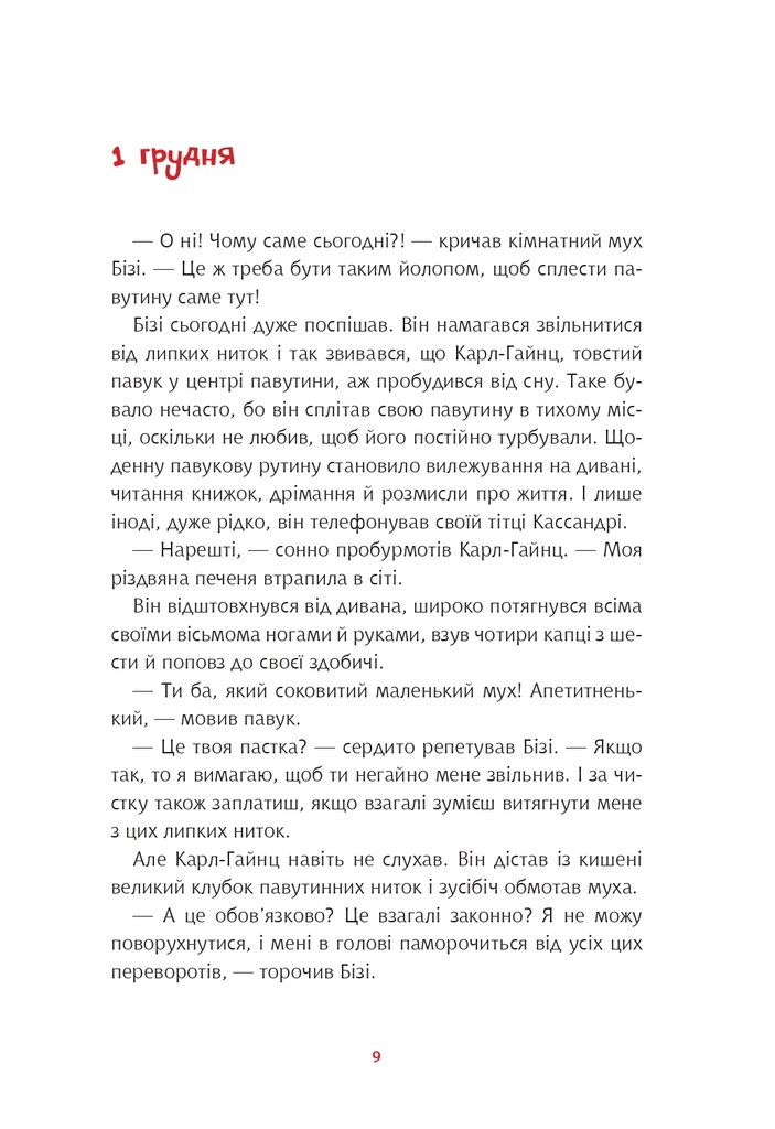 Одного чудового грудневого ранку сварливий павук Карл-Гайнц упіймав у павутиння кімнатного муха Бізі — майбутню смачну святкову печеню, яка визріватиме в павучій пастці аж до Святвечора. Бізі має всього 24 дні, щоб відрадити Карла-Гайнца від його задуму. І 24 дні, щоб усмак висотати з нього нерви...