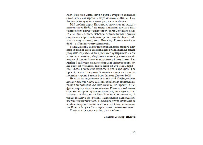 У своїй першій прозовій збірці Галина Лицур-Щадей явила нам образки навколишнього світу, що його спостерігає пильним оком. Дідо й баба Софія, ворожка й нещасна Марися, німий роботящий чоловік і успішний власник «розумного дому», відлюдник Михайло у горах і осамотіла Калина з клаптиком неба в місті - вони дихають, розмовляють, «жиють» тим, що їм судилося. Вони переважно пов’язані з горами, з їх багатством і небезпекою, зі щедрістю й суворістю, з красою, оспіваною й виспіваною, зафіксованою об’єктивом й невловимо мінливою в мить споглядання.