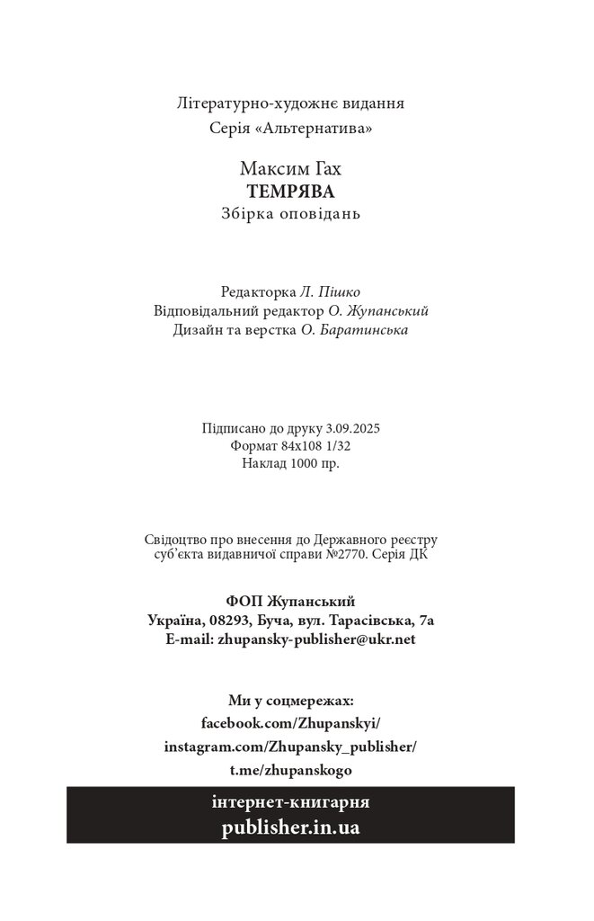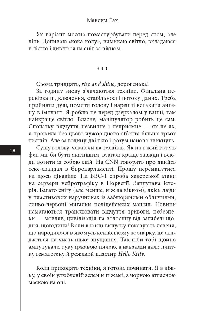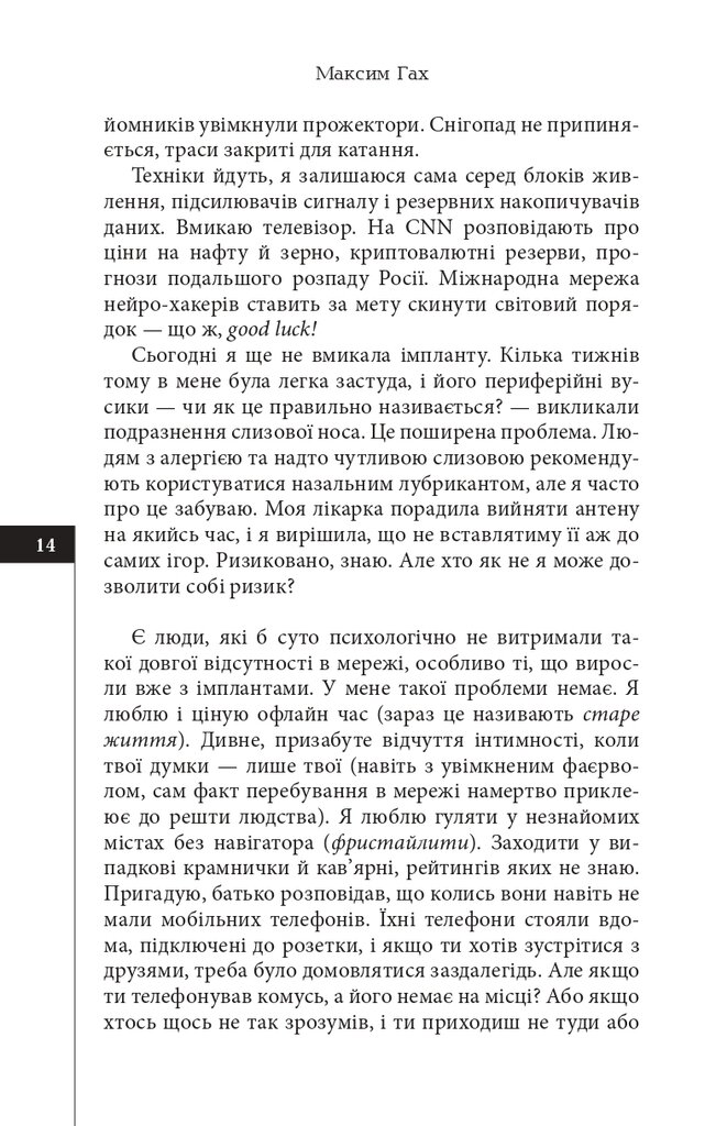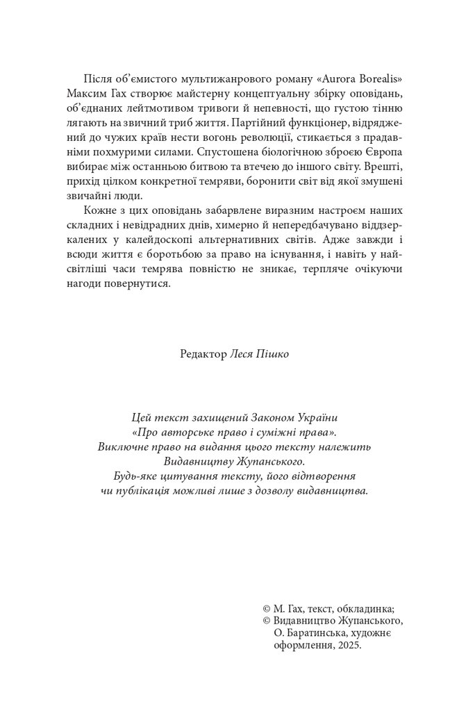 Після об’ємистого мультижанрового роману «Aurora Borealis» Максим Гах створює майстерну концептуальну збірку оповідань, об’єднаних лейтмотивом тривоги й непевності, що густою тінню лягають на звичний триб життя. Партійний функціонер, відряджений до чужих країв нести вогонь революції, стикається з прадавніми похмурими силами. Спустошена біологічною зброєю Європа вибирає між останньою битвою та втечею до іншого світу. Врешті, прихід цілком конкретної темряви, боронити світ від якої змушені звичайні люди.
