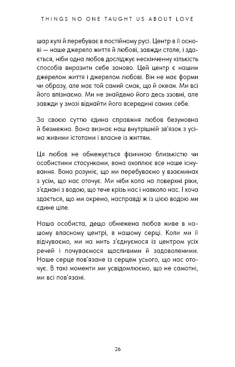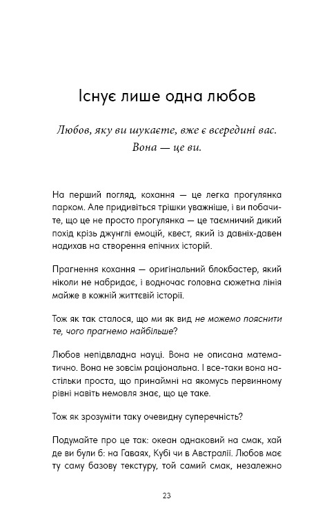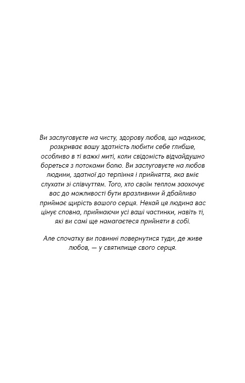 Люди — соціальні істоти. Але майже неможливо побудувати здорові, стійкі зв’язки з іншими, не маючи хороших стосунків із собою. Щоб порозумітися з іншими, ми часто змінюємо свої звички або приховуємо свою унікальність. Намагаючись змінити або придушити своє справжнє я, ми підриваємо свою самооцінку та самопізнання. Ми починаємо втрачати з поля зору те, ким ми є насправді й чого насправді хочемо. Коли наше саморозуміння та впевненість у собі пошкоджені, це зрештою шкодить нашим стосункам. У цій трансформаційній книзі автор бестселерів Векс Кінґ показує, як знаходити та підтримувати ті зв’язки, яких ми хочемо з собою та іншими. Хороші стосунки починаються з любові до себе й визнання власних бажань та потреб. Це дозволяє нам випромінювати впевненість, а також залучати й вибирати партнерів — романтичних і платонічних, — справді сумісних із нами