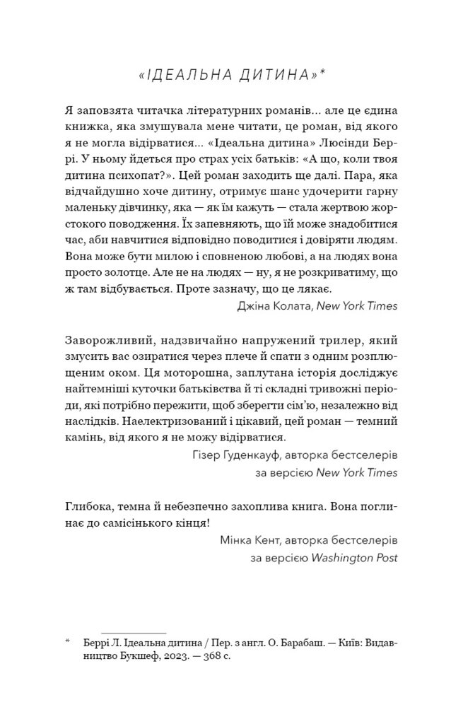 Чому всі думають, що до цього причетна Брук, мати-одиначка, яка розійшлася з дружиною, бо та захопилася зовсім юним створінням? Як Вітні впорається зі втратою найближчої подруги, з якою вона нерозлийвода від дитинства? Чому Джейд, попри позірну забезпеченість, купує меблі на розпродажах. І як допомогти її маленькій донечці подолати рак? Психологиня й дослідниця дитячих травм Люсінда Беррі, опираючись на багатющий фаховий досвід, створює динамічний психологічних трилер, де причини особистісних драм персонажів промальовано скрупульозно чітко і правди