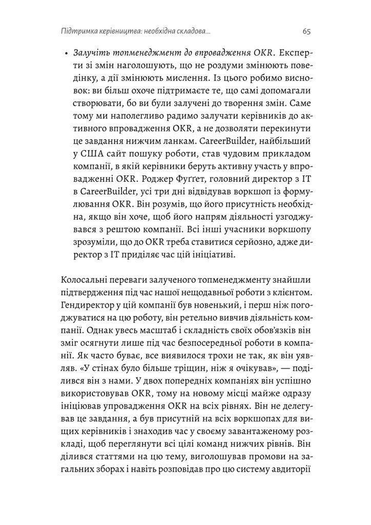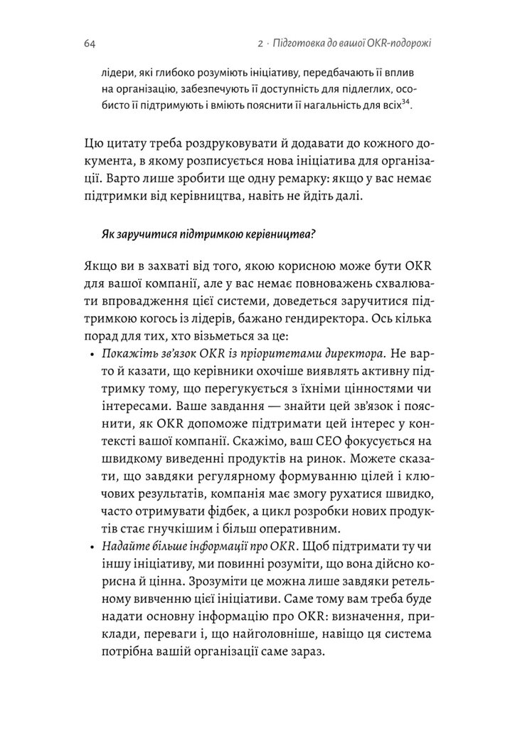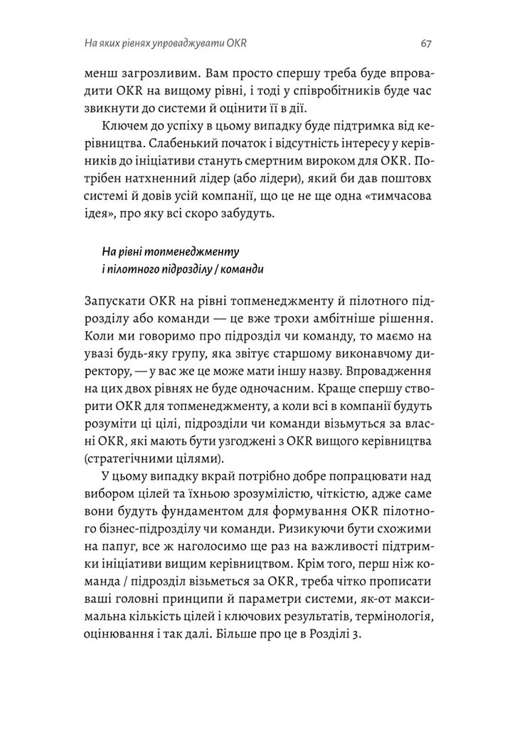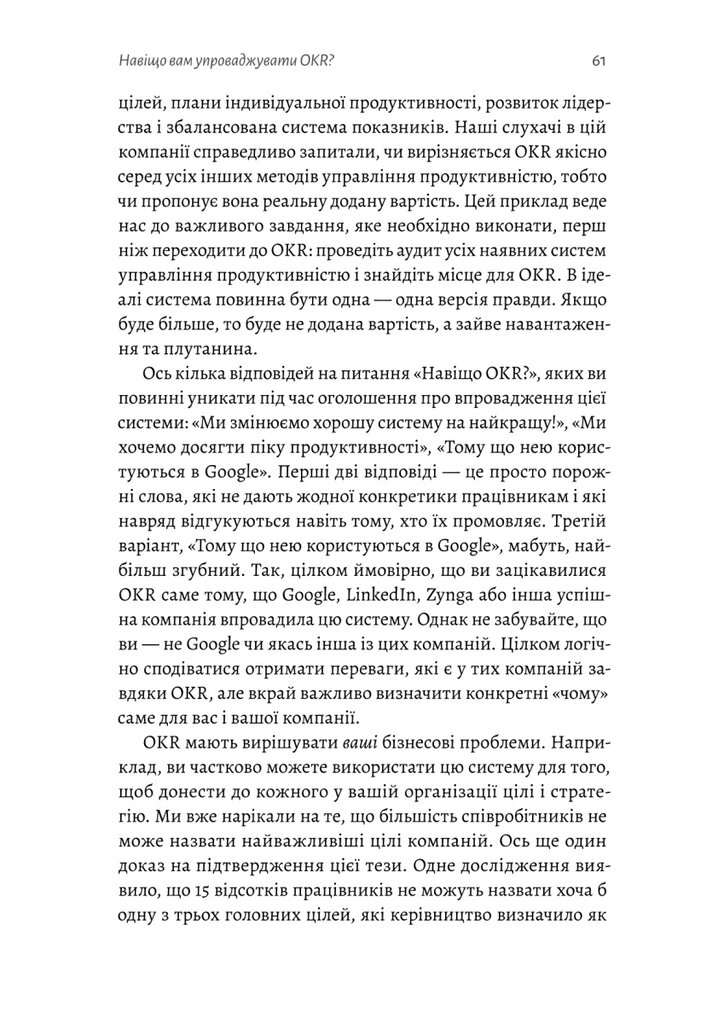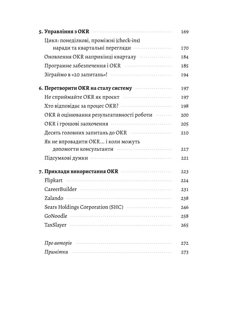 «Цілі та ключові результати» – перший повноцінний практичний посібник із OKR, продуктивної системи управління, яку використовують Google, LinkedIn, Spotify і тисячі ефективних компаній по всьому світу, розробленої для того, щоб допомогти організаціям створювати цінність за допомогою фокусування, узгодження і кращої комунікації.