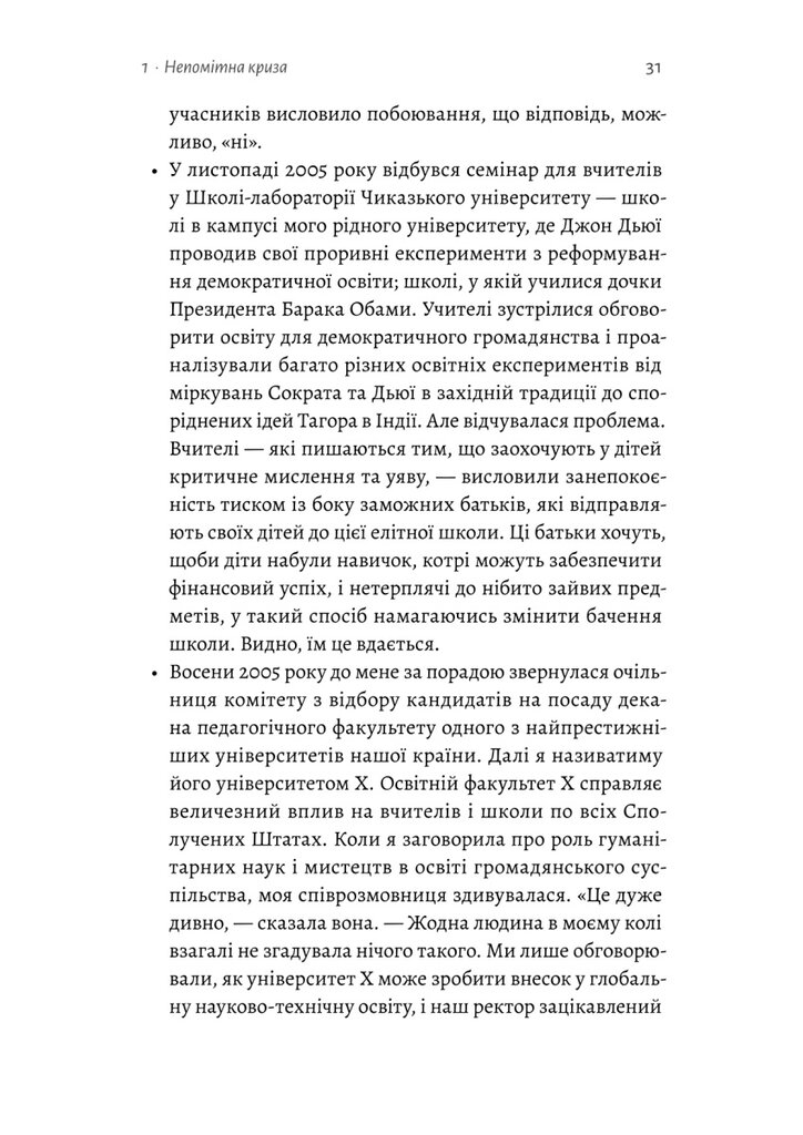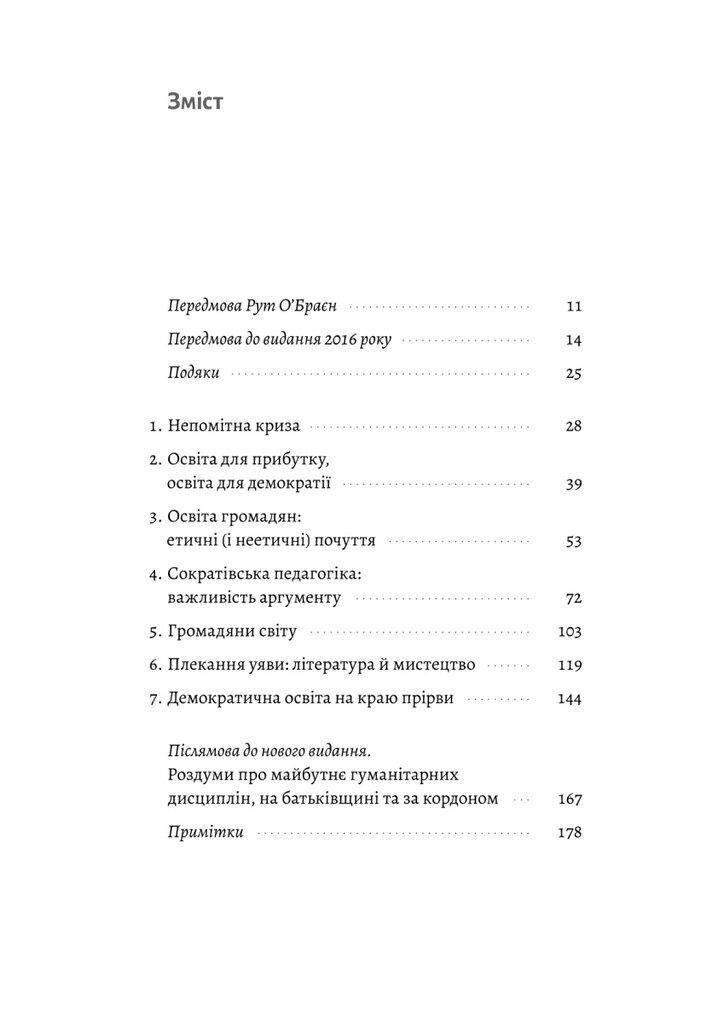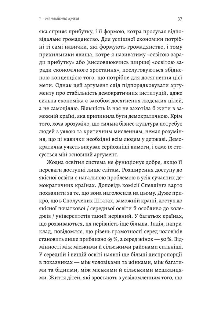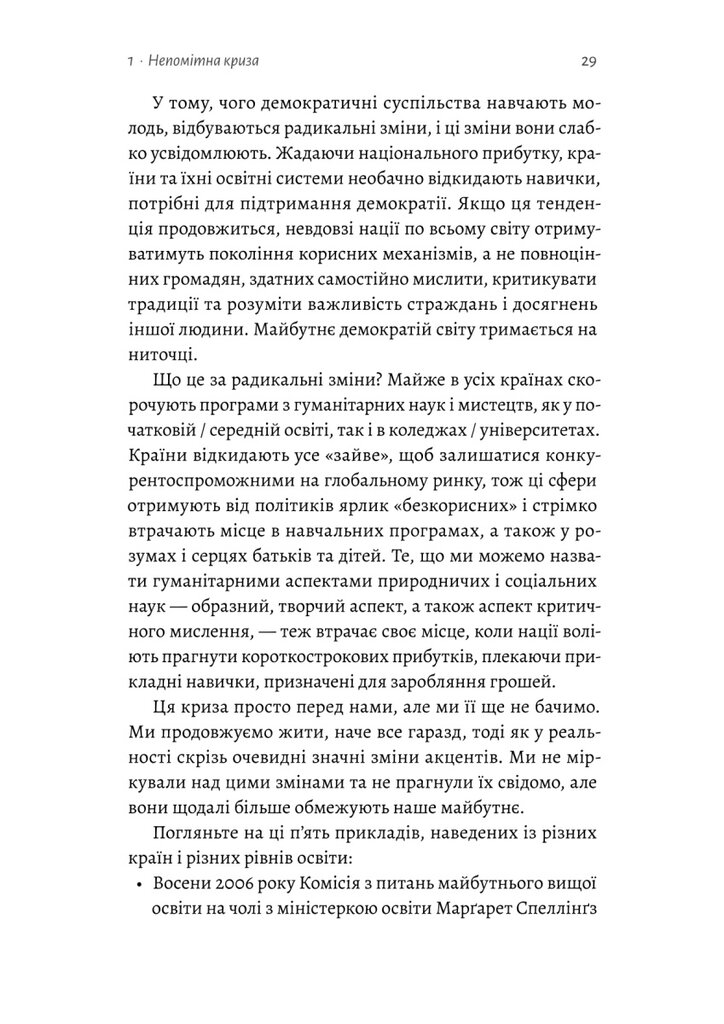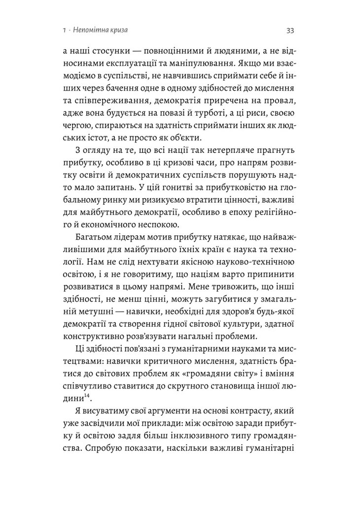 Гуманітарні науки завжди займали центральне місце в освіті, оскільки вважалися необхідними для формування компетентних демократичних громадян. Але зараз, стверджує Нуссбаум, уявлення про цілі освіти змінило напрям у всьому світі. Все частіше головною метою навчання виявляється формування навичок економічної продуктивності, а не критичного мислення й емпатійності. Цей короткозорий фокус на прибуткових навичках підриває здатність людини критикувати владу, зменшує симпатію до маргіналізованих та інакших, а також знижує компетентність у вирішенні складних, глобальних проблем. Втрата цих базових здібностей ставить під загрозу здоров'я демократій і надію на гідний світ.