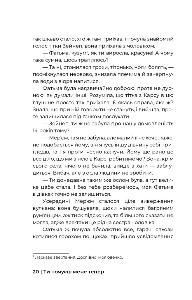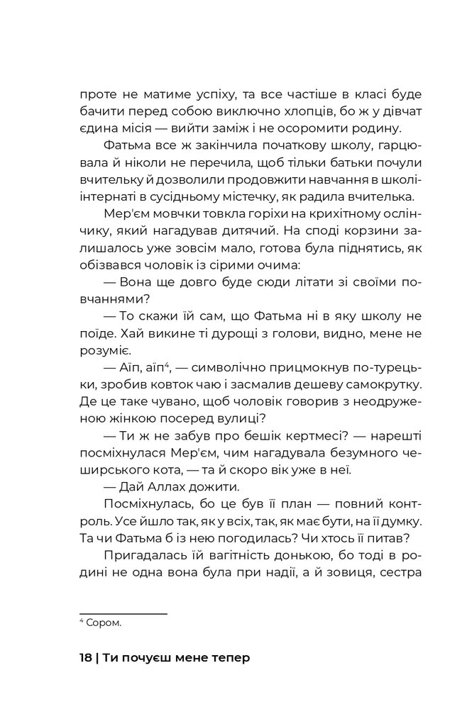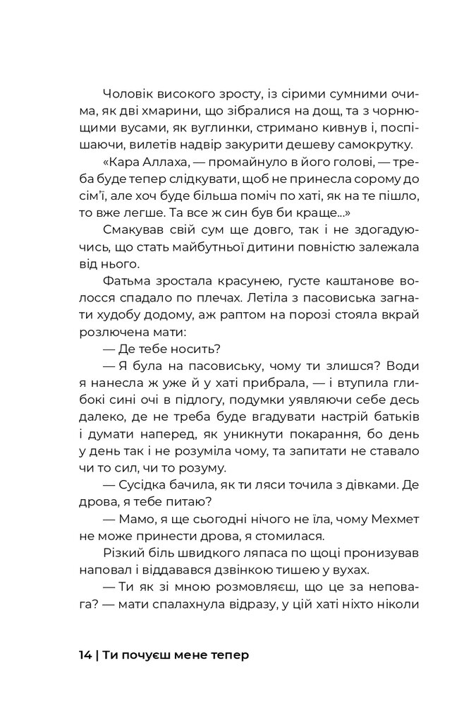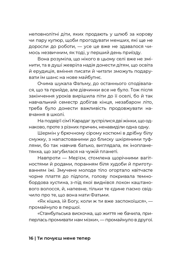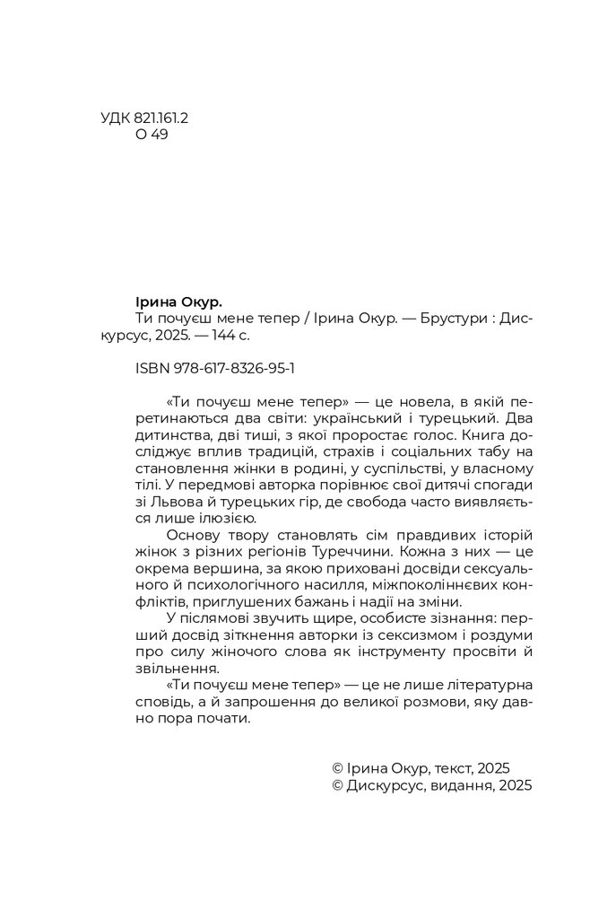 «Ти почуєш мене тепер» — це новела, в якій перетинаються два світи: український і турецький. Два дитинства, дві тиші, з якої проростає голос. Книга досліджує вплив традицій, страхів і соціальних табу на становлення жінки в родині, у суспільстві, у власному тілі. У передмові авторка порівнює свої дитячі спогади зі Львова й турецьких гір, де свобода часто виявляється лише ілюзією.