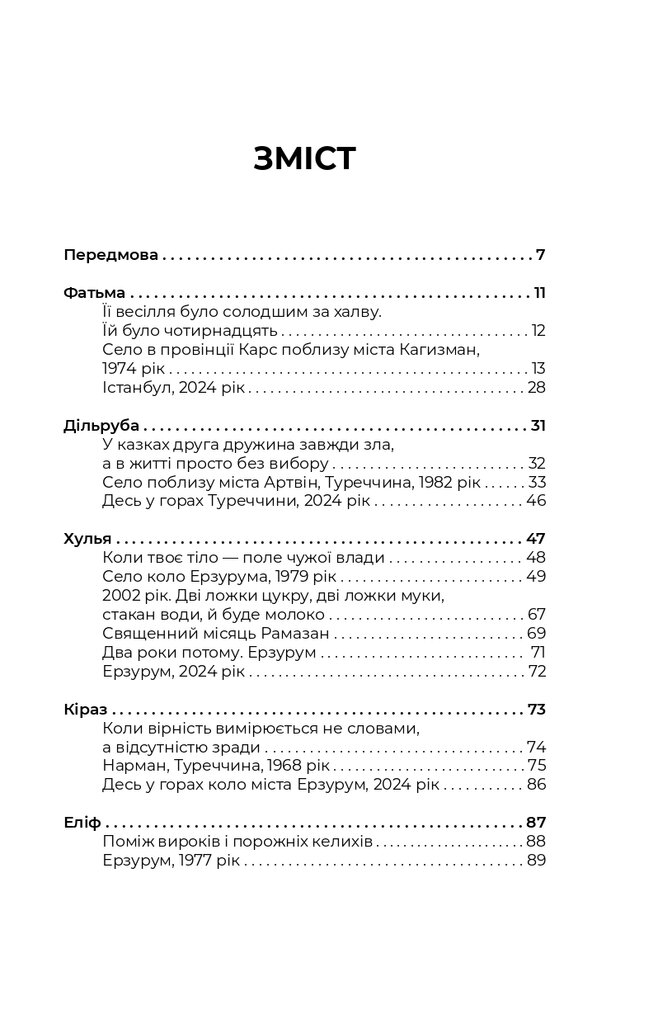Основу твору становлять сім правдивих історій жінок з різних регіонів Туреччини. Кожна з них — це окрема вершина, за якою приховані досвіди сексуального й психологічного насилля, міжпоколіннєвих конфліктів, приглушених бажань і надії на зміни.