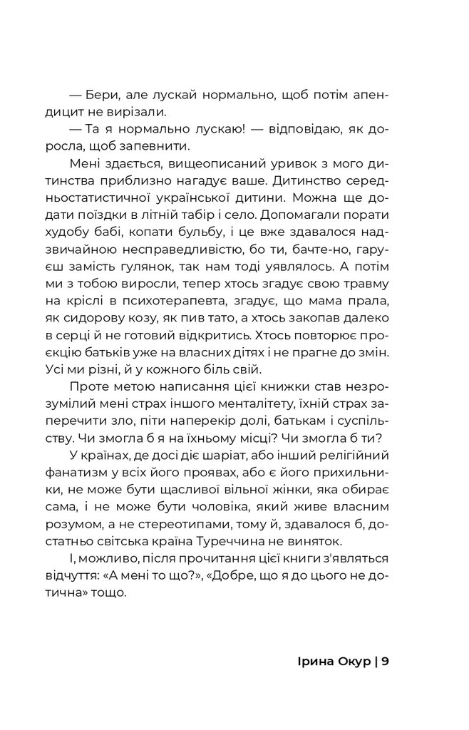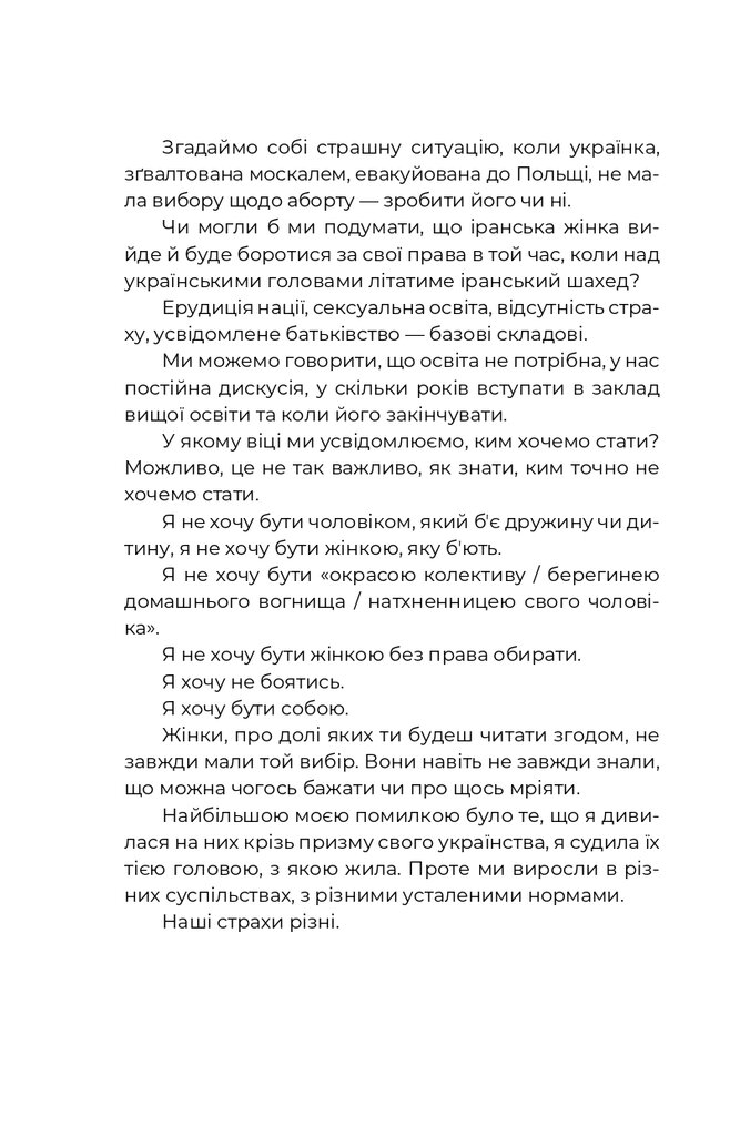 У післямові звучить щире, особисте зізнання: перший досвід зіткнення авторки із сексизмом і роздуми про силу жіночого слова як інструменту просвіти й звільнення.