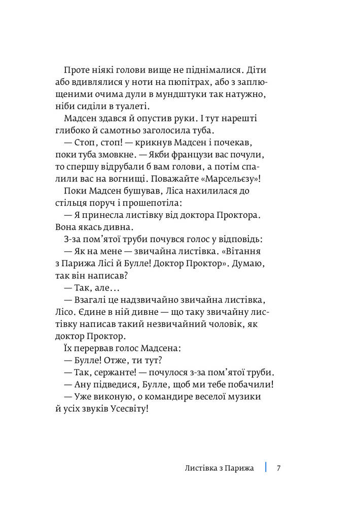 Книжка – як сніданок: не завджи подобається. Тому ось вам короткий переказ змісту цієї повісті: багато Ліси і Булле, закоханий професор, зникла дівчина, шалені перегони, мандрівки різними епохами, кілька страшних французьких бегемотів, супер-велосипедист Едді, трішки пукального порошку, моторошна жінка з дерев’яною ногою на скрипучих коліщатках, Наполеон, Жанна д’Арк, війна, смерть і кохання. А також прийнятна доза обвислих вусів, рубання голів і спалювання відьом. Неймовірна подорож у часі, просторі та ванні.