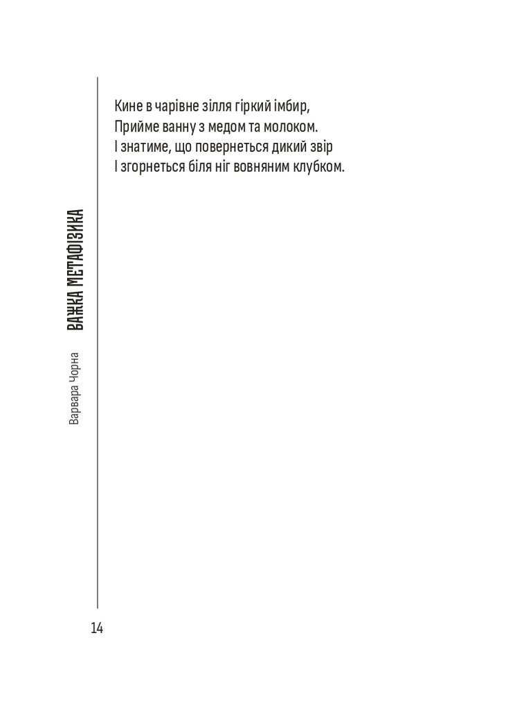 «Важка метафізика» — збірка віршів одеської поетки та юнґіанської психологині Варвари Чорної. У своїх віршах авторка іронічно переосмислює міфологічні та казкові сюжети в сучасній реальності, мандрує соціальними та асоціальними контекстами, складає вигадливі мозаїки сенсів, грає міськими наративами та деконструює звичний хід речей.