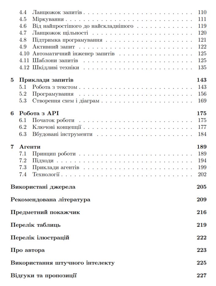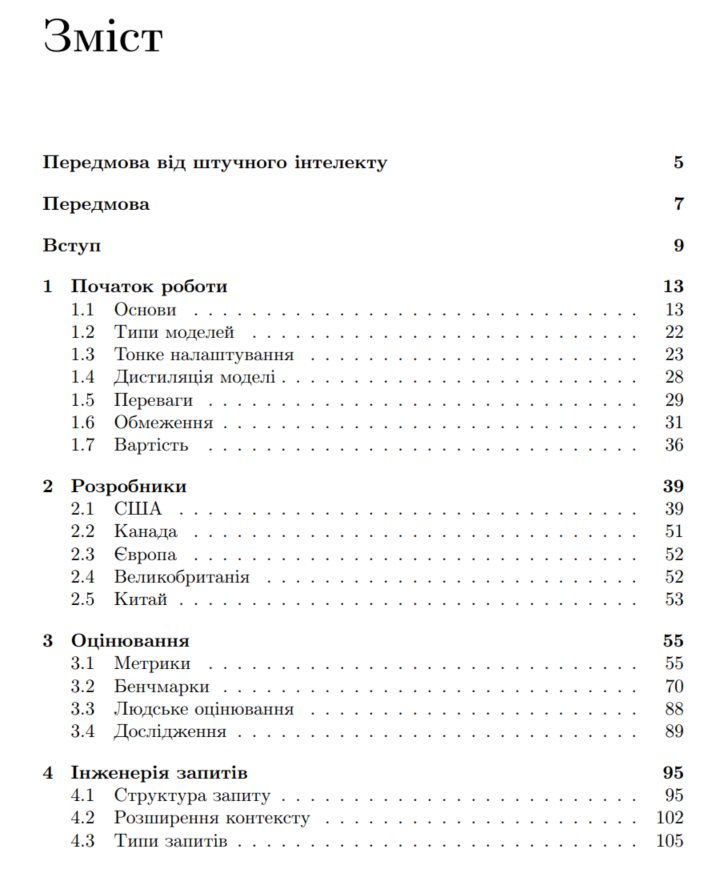 У книзі висвiтлено архiтектуру великих мовних моделей, методи їхньої оптимiзацiї, пiдходи до оцiнювання якостi результатiв i способи iнтеграцiї в автоматизованi робочi процеси. Книга стане корисною для дослiдникiв, iнженерiв, студентiв i фахiвцiв, якi вже працюють або лише планують працювати з генеративним штучним iнтелектом.