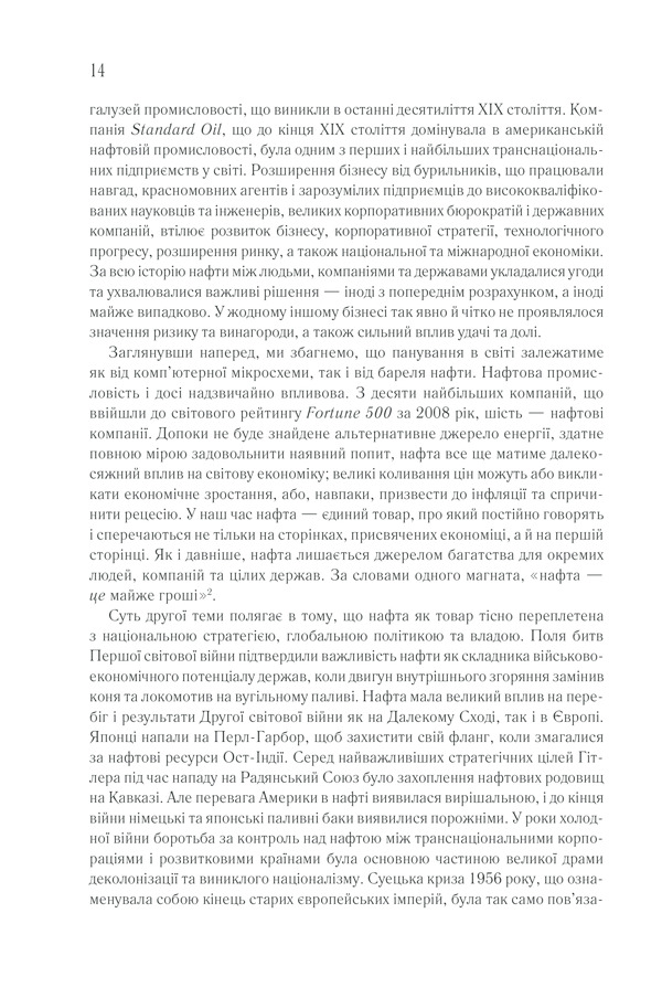 Водночас це історія окремих людей, потужних економічних сил, технологічних змін, політичної боротьби, міжнародних конфліктів і по-справжньому епічного повороту. Автор цієї книжки сподівається, що дослідження економічних, соціальних, політичних і стратегічних наслідків того, що наш світ залежить від нафти, висвітлить минуле, дасть змогу ліпше зрозуміти теперішнє й допоможе передбачити майбутнє.