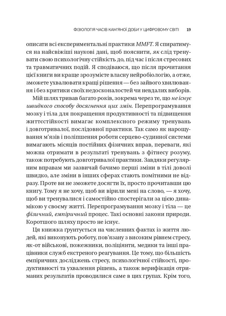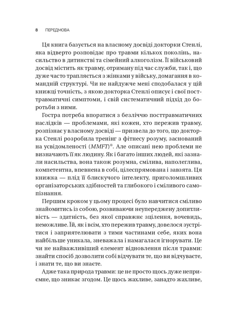 У нонфікшні авторка фокусується на темі відновлення після травми психологічного характеру, що супроводжується тілесними симптомами. Розкриваючи концепти курсу MMFT, докторка Стенлі розповідає, як відновити усвідомленість і розвинути здатність знаходити свободу дій і можливість вибору у будь-якій ситуації. Програма тренування життєстійкості Mindfulness-based Mind Fitness Training базується на системному підході до боротьби з посттравматичними реакціями, тому читачі поступово дізнаватимуться, як розширити вікно толерантності до стресового збудження.