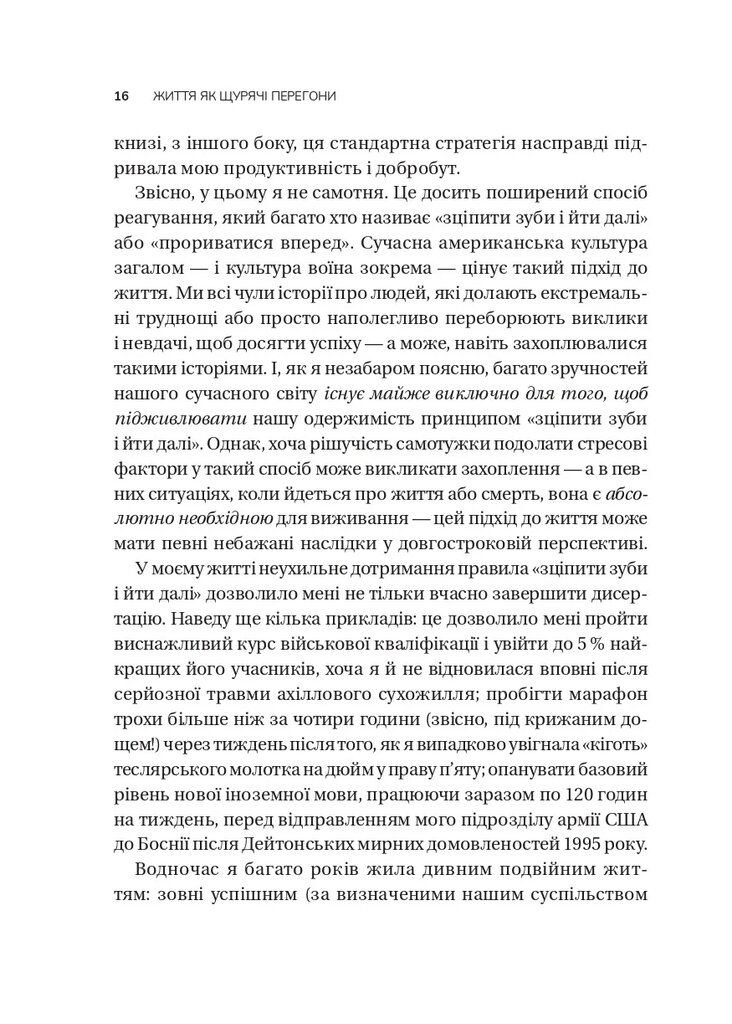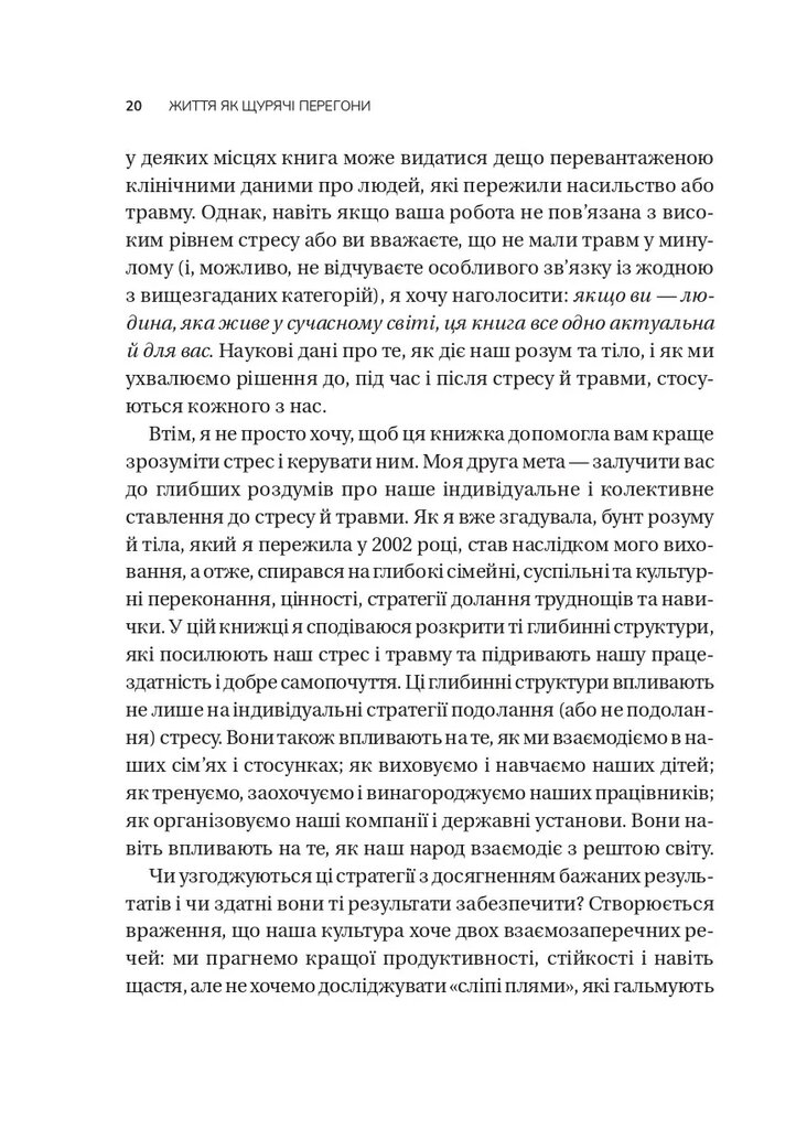 Травми змінюють наше світосприйняття. Сама травматична подія зостається в минулому, а посттравматичні реакції позбавляють нас повноцінного життя сьогодні. Травматичний досвід зберігається поза нашою свідомістю й проявляється у фізичних симптомах і саморуйнівних діях. Книжка Елізабет Стенлі — ключ до усвідомленості, а відтак і зцілення. Авторка досліджує культурні норми, які перешкоджають життєстійкості, зокрема колективну тенденцію відокремлювати стрес від його наслідків і нехтувати потребою у відновленні. Особистий досвід дозволив Елізабет Стенлі розробити інноваційний підхід до одужання від стресу та травм, щоб дати цивільним і військовим інструменти для покращення саморегуляції та психологічної стійкості.