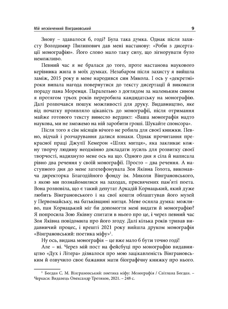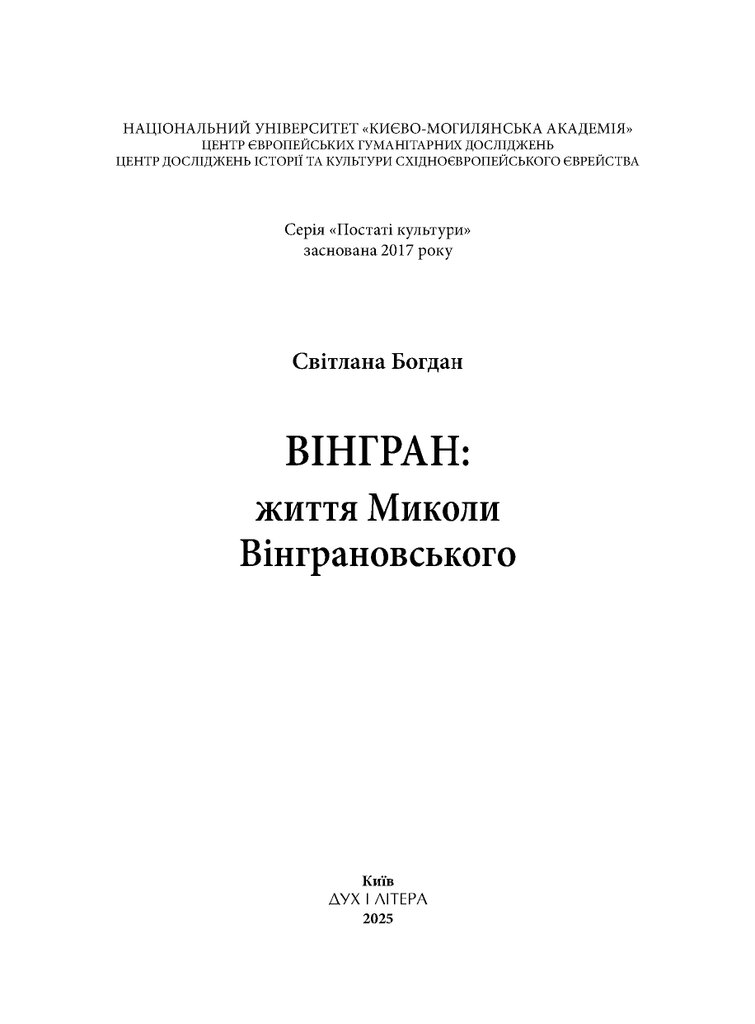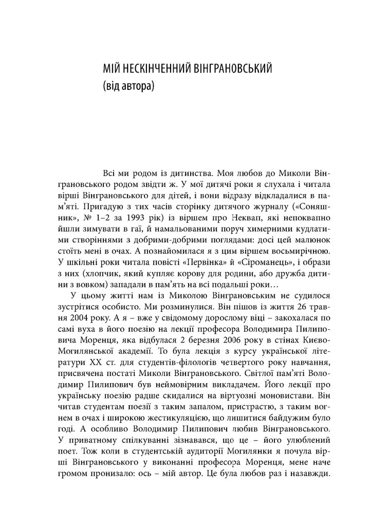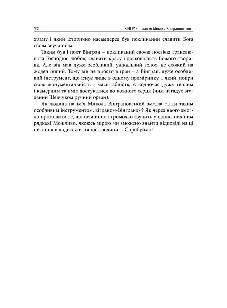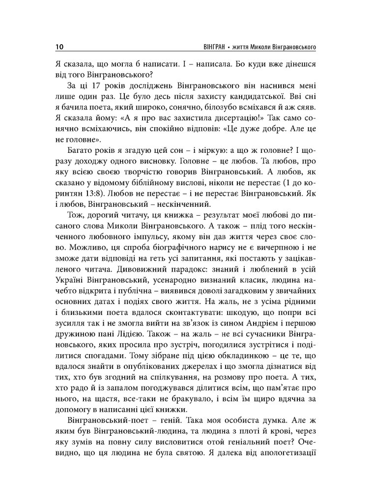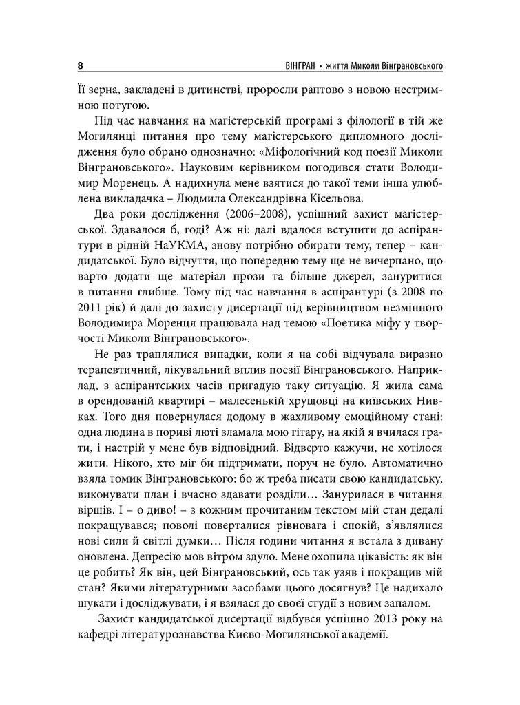 Книжка «Вінгран: життя Миколи Вінграновського» є першою повною і детальною біографією Миколи Вінграновського (1936–2004), відомого українського поета-шістдесятника, а також – прозаїка, режисера й актора, першого президента Українського ПЕН. Це документальний текст, базований на свідченнях родичів і друзів митця, на опублікованих спогадах про нього, на документах з українських архівних установ і музеїв: авторка намагається з’ясувати, що в біографії Вінграновського є міфом, а що – реальністю. Водночас тут подано авторський погляд на цю біографію, зроблено спробу завдяки методу біографічних закономірностей знайти й описати основний життєвий жест і перманентну життєву драму Вінграновського: дарування краси – і неприйняття цього дару, його відкидання. Також ідеться про ширший історико-культурний контекст: Україна доби СРСР і початку епохи незалежності.