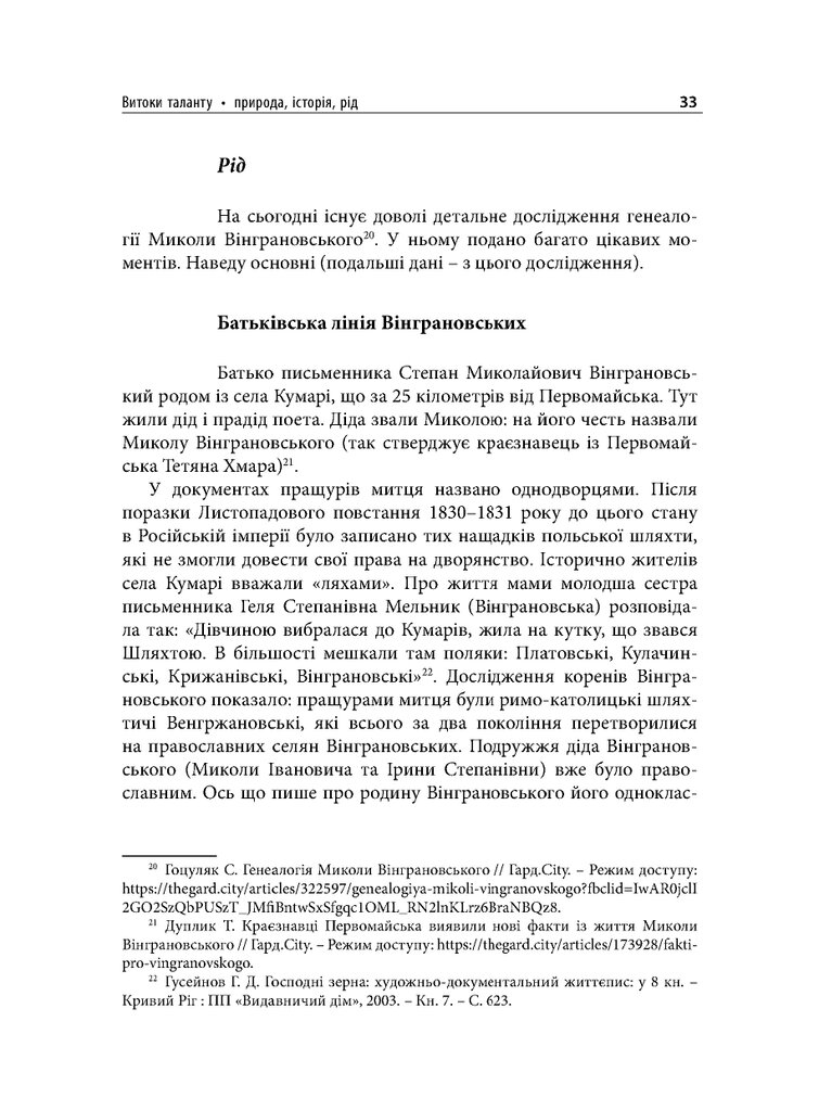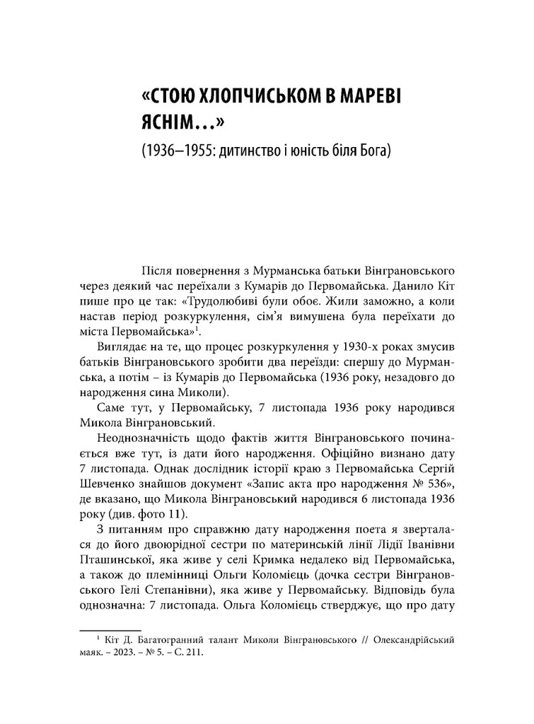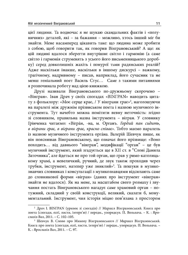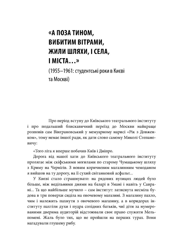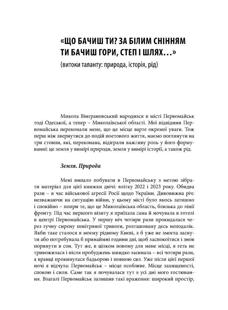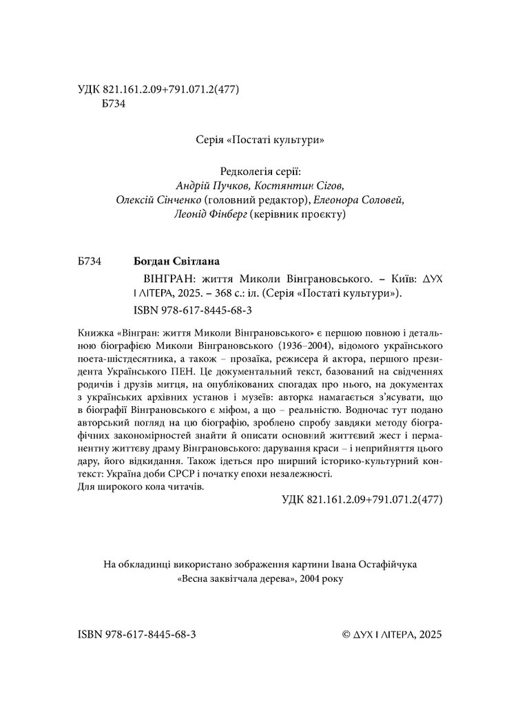 Книжка «Вінгран: життя Миколи Вінграновського» є першою повною і детальною біографією Миколи Вінграновського (1936–2004), відомого українського поета-шістдесятника, а також – прозаїка, режисера й актора, першого президента Українського ПЕН. Це документальний текст, базований на свідченнях родичів і друзів митця, на опублікованих спогадах про нього, на документах з українських архівних установ і музеїв: авторка намагається з’ясувати, що в біографії Вінграновського є міфом, а що – реальністю. Водночас тут подано авторський погляд на цю біографію, зроблено спробу завдяки методу біографічних закономірностей знайти й описати основний життєвий жест і перманентну життєву драму Вінграновського: дарування краси – і неприйняття цього дару, його відкидання. Також ідеться про ширший історико-культурний контекст: Україна доби СРСР і початку епохи незалежності.