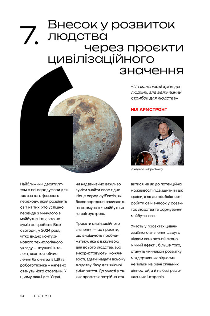 Документ включає не лише теоретичні викладки, а и конкретні механізми реалізаціі запропонованих змін, детальні дорожні карти реформ та перелік ключових проєктів розвитку. Особлива увага приділяється ролі Украіни у вирішенні глобальних викликів людства та іі потенціиному внеску у світовии прогрес.