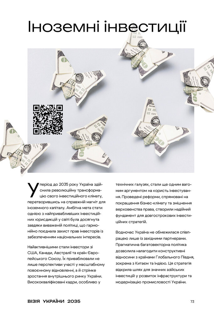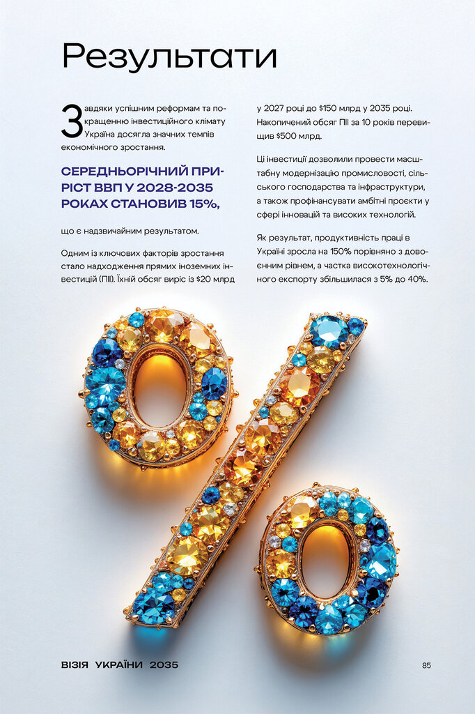 Представлена робота є комплексним дослідженням перспектив розвитку Украіни до 2035 року і містить детальнии аналіз потенціиних трансформаціи у ключових сферах держави: безпеці, економіці, соціальніи політиці, технологіях та культурі. В основі дослідження лежить концепція побудови сильноі, інноваціиноі держави, що базується на принципах справедливості, свободи та людськоі гідності.