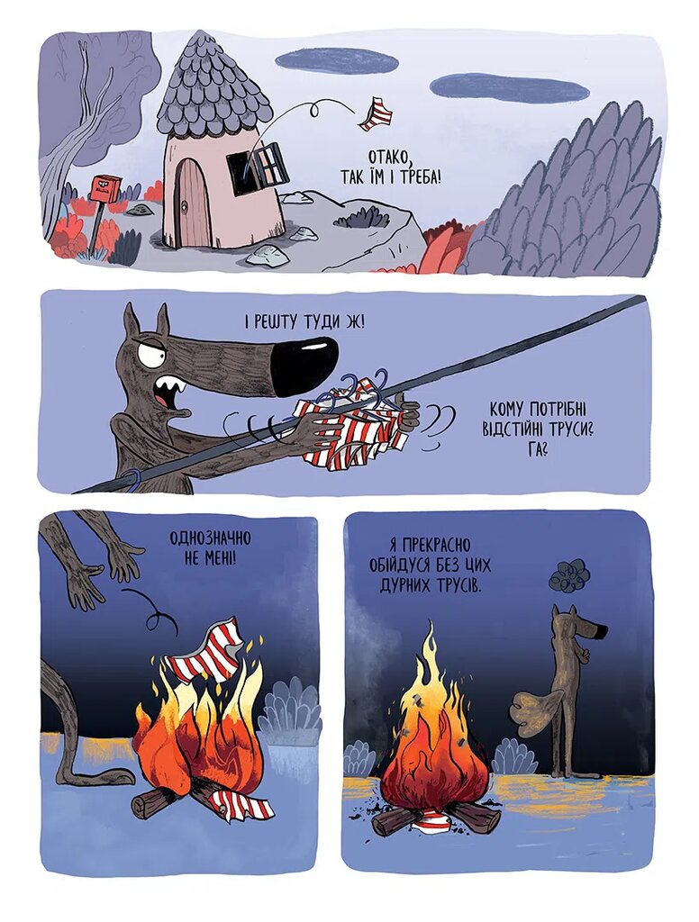Вовк у розпачі, його моральний дух на дні. А все через те, що за час його відсутності у лісі з’явилась мода на труси Вовчіні! Тепер усі звірі хизуються білизною, яка стала частиною особистості Вовка. Серце бідного Вовчика розбите. Як так? Лише він мав право їх носити! Але тепер, коли всі навколо світять смугастими трусами, він просто зливається з натовпом. Як повернути собі унікальність?..