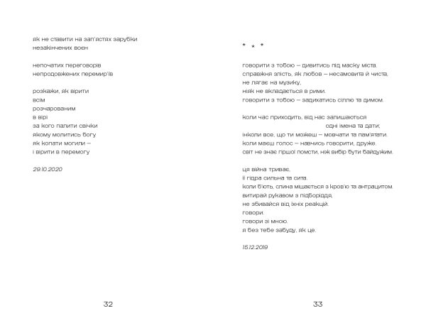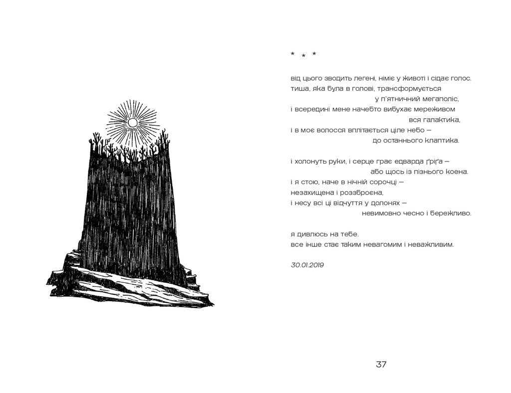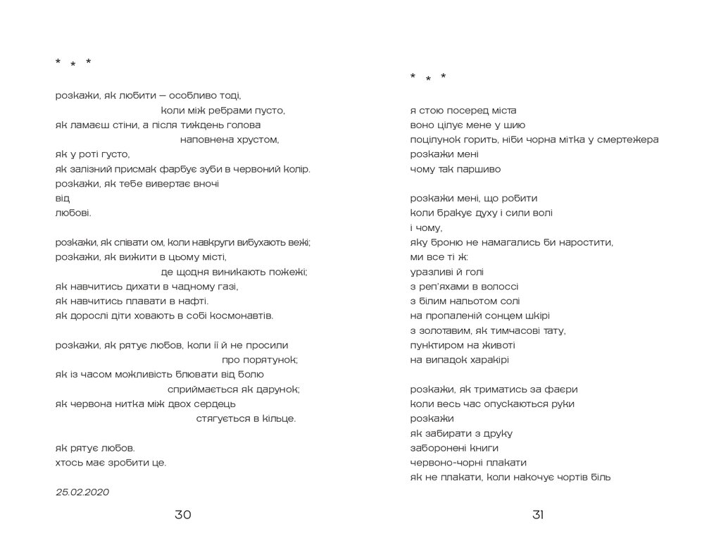 Надія Глушкова — одеська журналістка і поетеса. Її дебютна збірка — про втрати і знахідки, про непроникний морок і світло всередині кожного з нас. У тенетах часів гібридного та повномасштабного етапів російсько- української війни Надія шукає вогонь своєї ґенерації, говорить про те, що часто замовчується, розповідає про території і часи. Голоси героїв — відомих і незнаних — переплітаються у хор поколінь, тривожний рюкзак стає домом, а смерть — смерть відступає. «Адже світло сильніше темряви, навіть — пам’ять про світло».