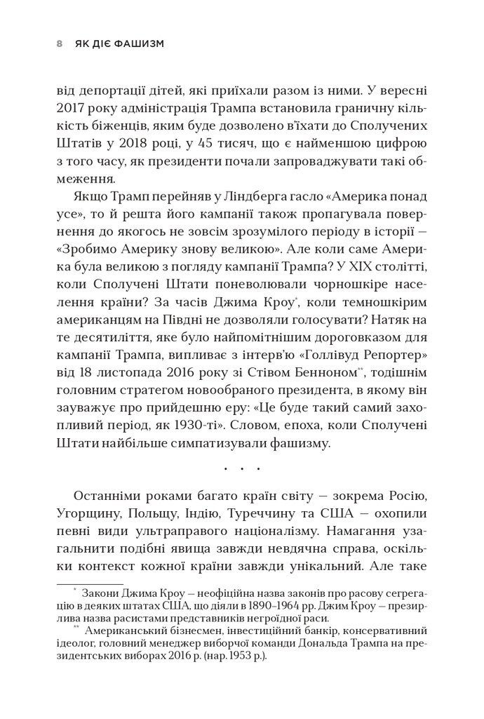 Незважаючи на значний поступ демократії в усьому світі, останніми роками спостерігається підвищення інтересу до застосування методів фашистської політики навіть у найрозвиненіших демократичних країнах. Чим викликані такі тенденції і як їх розпізнати? Чому фашизм піднімає голову на теренах Європи й Америки? Філософ з Єльського університету Джейсон Стенлі визначає ознаки, що дають змогу простежити скочування країн до елементів фашизму: вигадування «славетного» минулого на противагу реальним історичним подіям, боротьба з інтелектуалами, спроби ієрархічної побудови суспільства, використання сучасних ЗМІ як засобів пропаганди на користь однієї суспільної групи чи політичної партії тощо. Дослідник пояснює, як фашистські політики намагаються збурювати в суспільстві паніку, нав’язувати свої стереотипи та применшувати здобутки ліберальної демократії, на якій побудована сучасна західна цивілізація, а також вказує на загрози, які принесе з собою демагогічна риторика і практика неофашистів у США, Угорщині та деяких інших країнах, якщо їх вчасно не виявити та не зупинити.