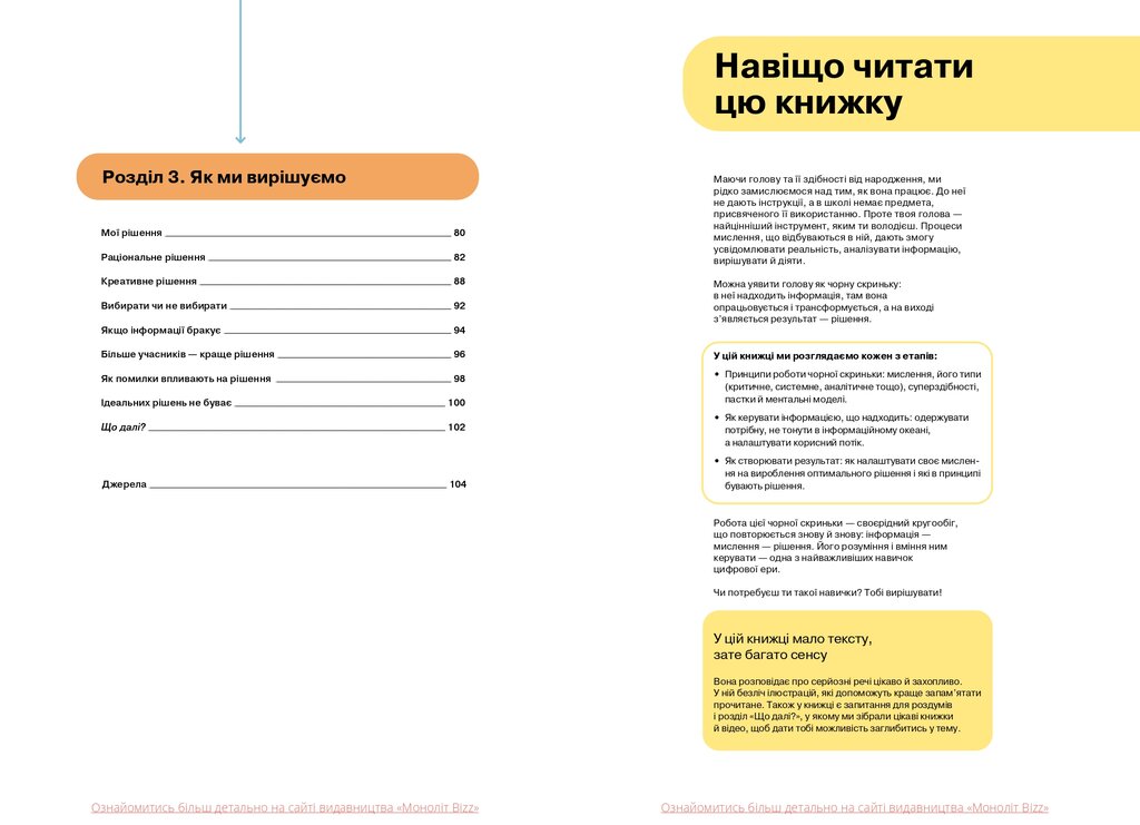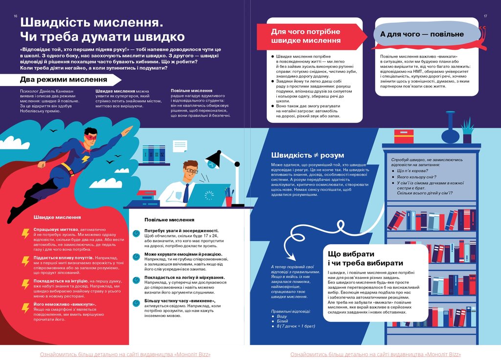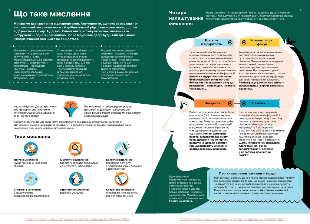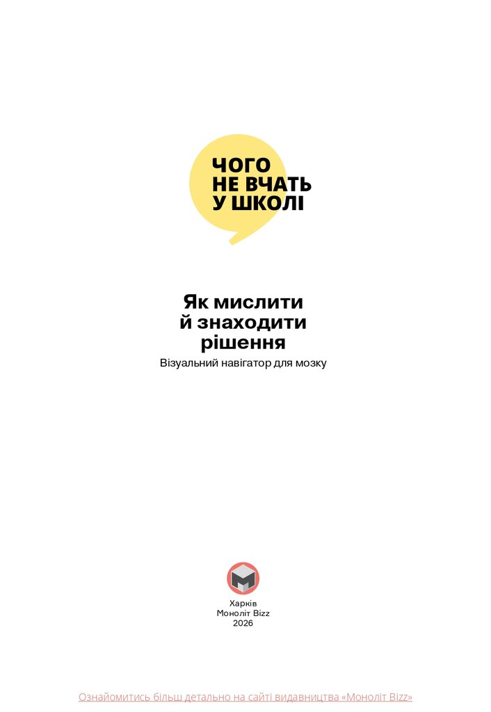 Це своєрідна «інструкція користувача» для найважливішого органу — людського мозку. Видання стане незамінним помічником для всіх підлітків та допитливих людей, які прагнуть мислити глибше, діяти впевненіше та розвивати навички системного підходу до будь-яких завдань. Ця книжка не просто пояснює — вона навчає бачити проблему з нового ракурсу та приймати рішення усвідомлено й креативно.