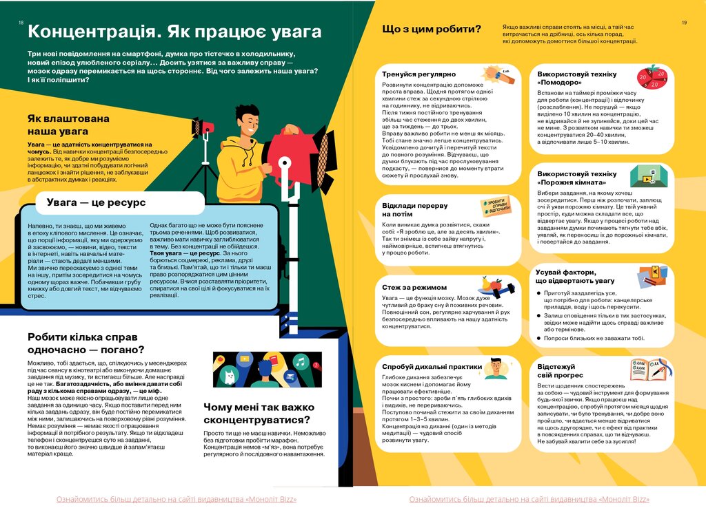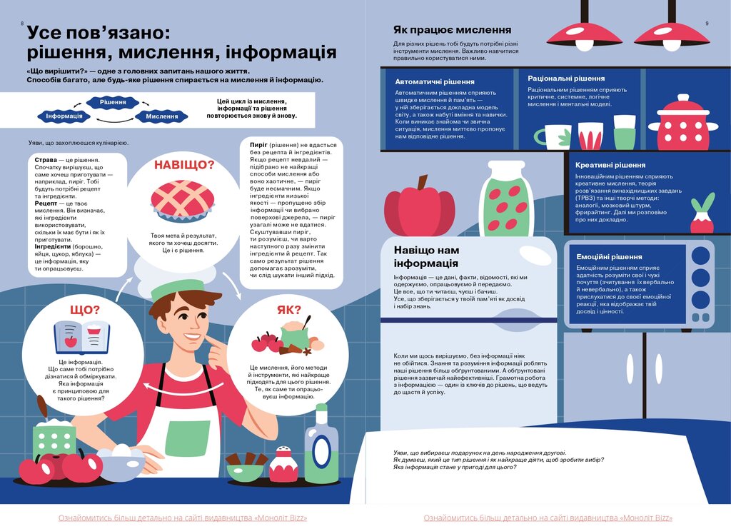 Книжка просто й наочно пояснює, як мозок сприймає інформацію, приймає рішення, реагує на стрес чи формує звички. Завдяки інфографікам, прикладам і практичним порадам читач легко розбереться в механізмах власного мислення та навчиться ефективніше керувати увагою, емоціями й поведінкою.