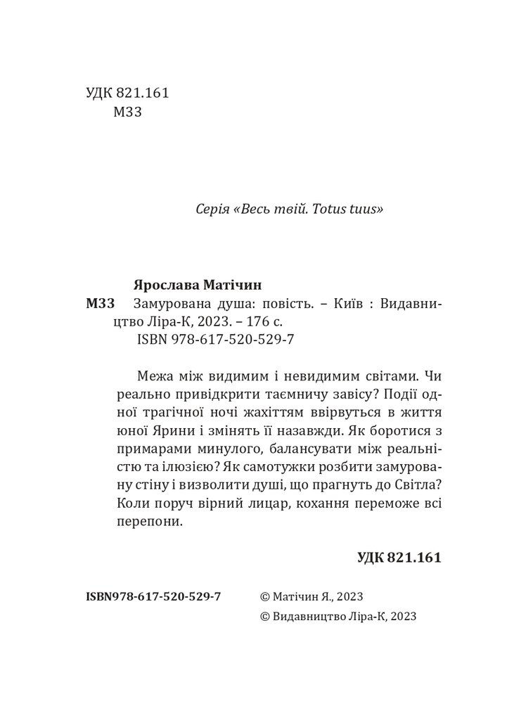 Межа між видимим і невидимим світами. Чи реально привідкрити таємничу завісу? Події одної трагічної ночі жахіттям ввірвуться в життя юної Ярини і змінять її назавжди. Як боротися з примарами минулого, балансувати між реальністю та ілюзією? Як самотужки розбити замуровану стіну і визволити душі, що прагнуть до Світла? Коли поруч вірний лицар, кохання переможе всі перепони.