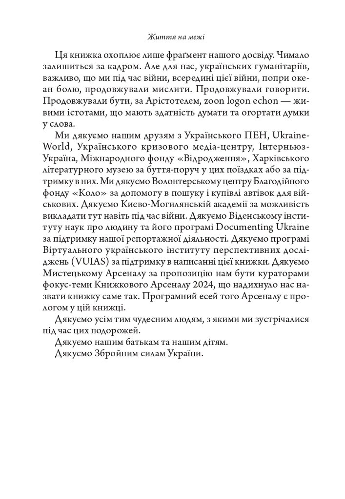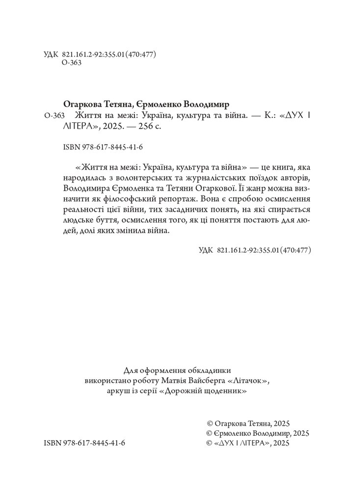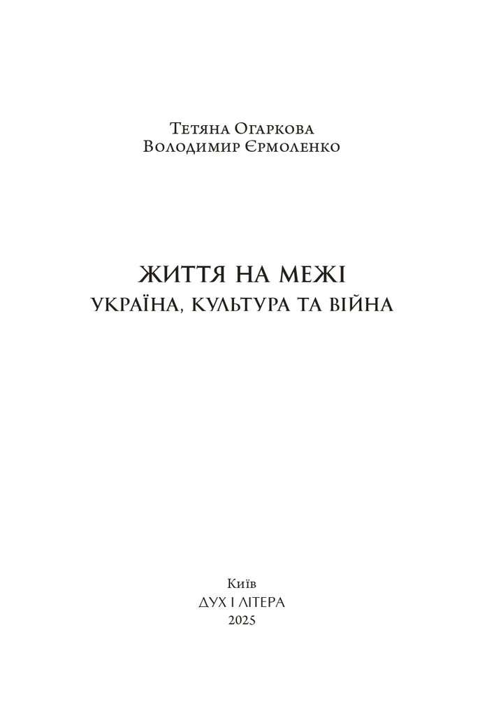 «Життя на межі: Україна, культура та війна» — це книга, яка народилась з волонтерських та журналістських поїздок авторів, Володимира Єрмоленка та Тетяни Огаркової. Її жанр можна визначити як філософський репортаж. Вона є спробою осмислення реальності цієї війни, тих засадничих понять, на які спирається людське буття, осмислення того, як ці поняття постають для людей, долі яких змінила війна.